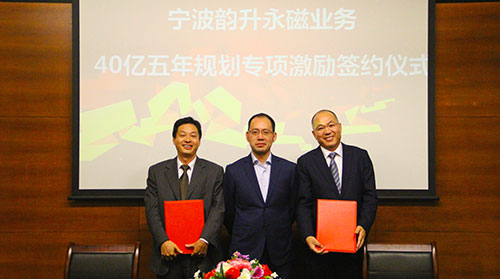 在今年年初的集团年度工作会议上,集团董事局提出了五年销售收入破百亿的战略目标。永磁作为公司第一大支柱产业,自然是首当其冲,重任在肩。8月12日,公司永磁业务40亿五年规划专项激励签约仪式在二园报告厅举行。7家事业部率先与公司完成签约,作为主力军向五年40亿的目标发起冲击。