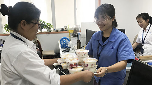 活动开始前,事业部综合管理科的成员驱车前往附近的商超,购买新鲜水果、冷藏酸奶,并布置好会场,做好活动的所有准备工作。活动中,综合管理科负责统筹,事业部其他各科室派员积极参与其中。大家自主加入水果组、芋圆组、分装组、配送组,整个事业部的部门代表分工协作。很快,一份份载满心意的水果捞就制作完成了。我们准备了Q弹Q弹的芋圆,还有芒果、猕猴桃、火龙果、西瓜、香蕉等多种水果,当把这些水果削皮切开,一刹那满屋子飘着果香。冰凉的鲜果再淋上香浓的酸奶,真是直叫人流口水。