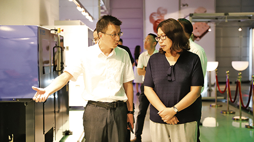 在公司展示中心,公司相关负责人向王新一行详细介绍了韵升的发展历程、产业布局及自主创新等方面的情况。王新认真听取了讲解。在参观过程中,结合具体的产品应用场景,双方进行了细致的探讨。